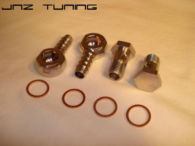 This kit will allow you to adapt a 3/8″ (6AN) hose to the water jackets of T2, GT25, GT30, GT35, MHI TD05 bearing housings or any turbocharger that requires M14 x 1.5mm fittings.